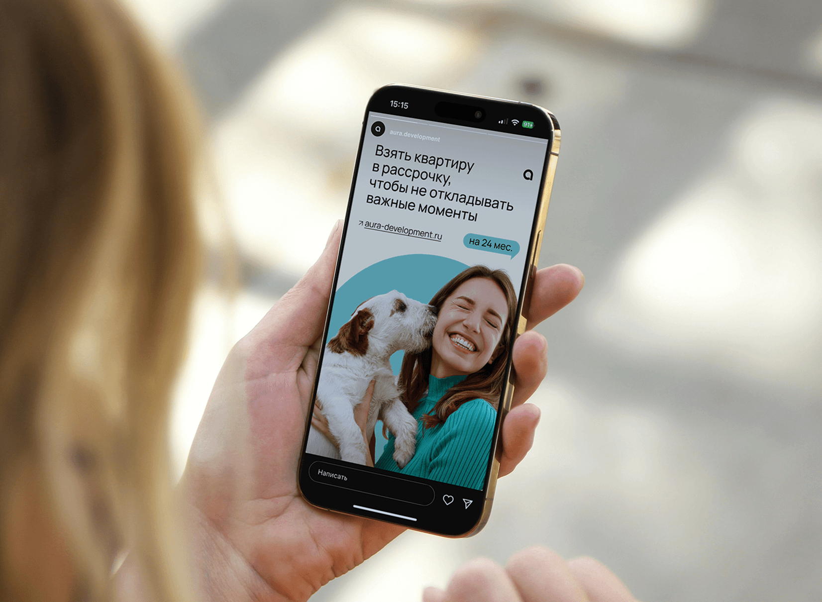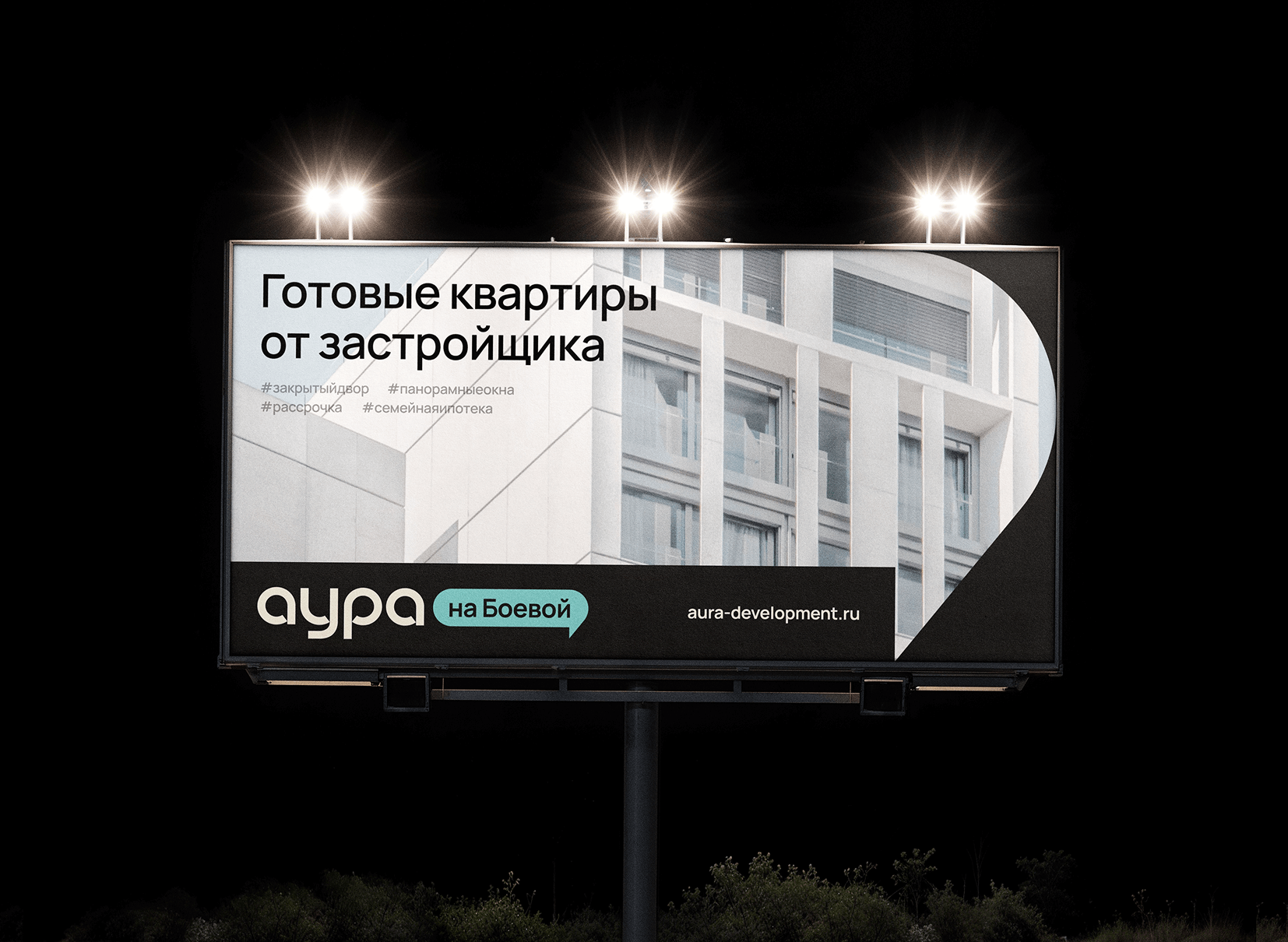 Плашка для наименования жилого комплекса выполнена в форме диалогового окна, так как этот образ ассоциируется с коммуникацией, диалогом и вниманием к человеку. Такая форма подчеркивает открытость бренда, его стремление быть ближе к жителям и говорить с ними на одном языке.