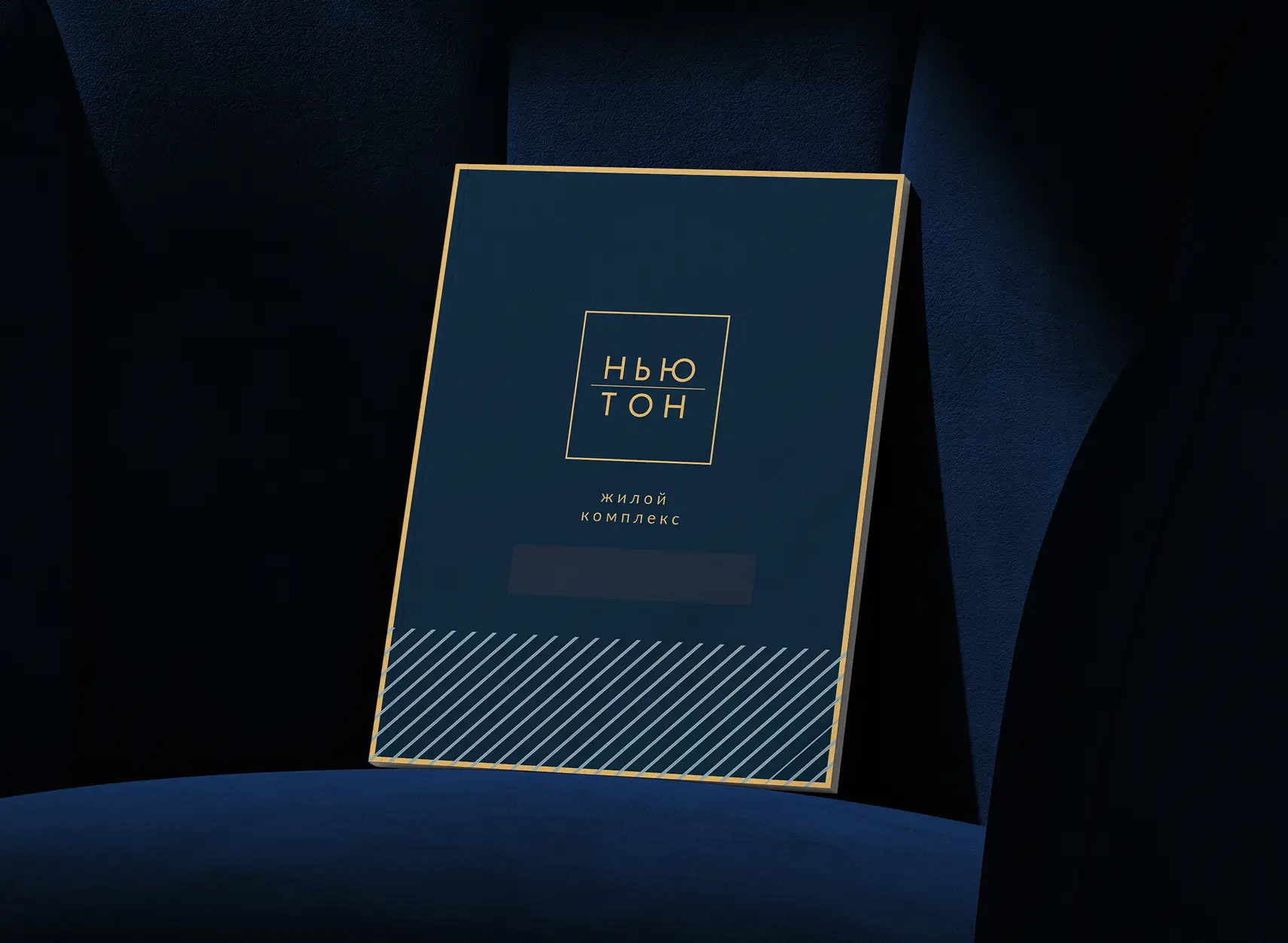 Брендинг строится на сочетании архитектурной строгости и минимализма: квадратная форма логотипа символизирует стабильность и надежность, тонкие линии и симметрия подчеркивают современность и уравновешенность, фирменная палитра из глубокого синего, графитового и благородного золотисто-бежевого создает образ уверенного и основательного проекта, а фирменный паттерн с четкими линиями отсылает к архитектуре и подчеркивает концепцию качества и продуманности жилого комплекса.