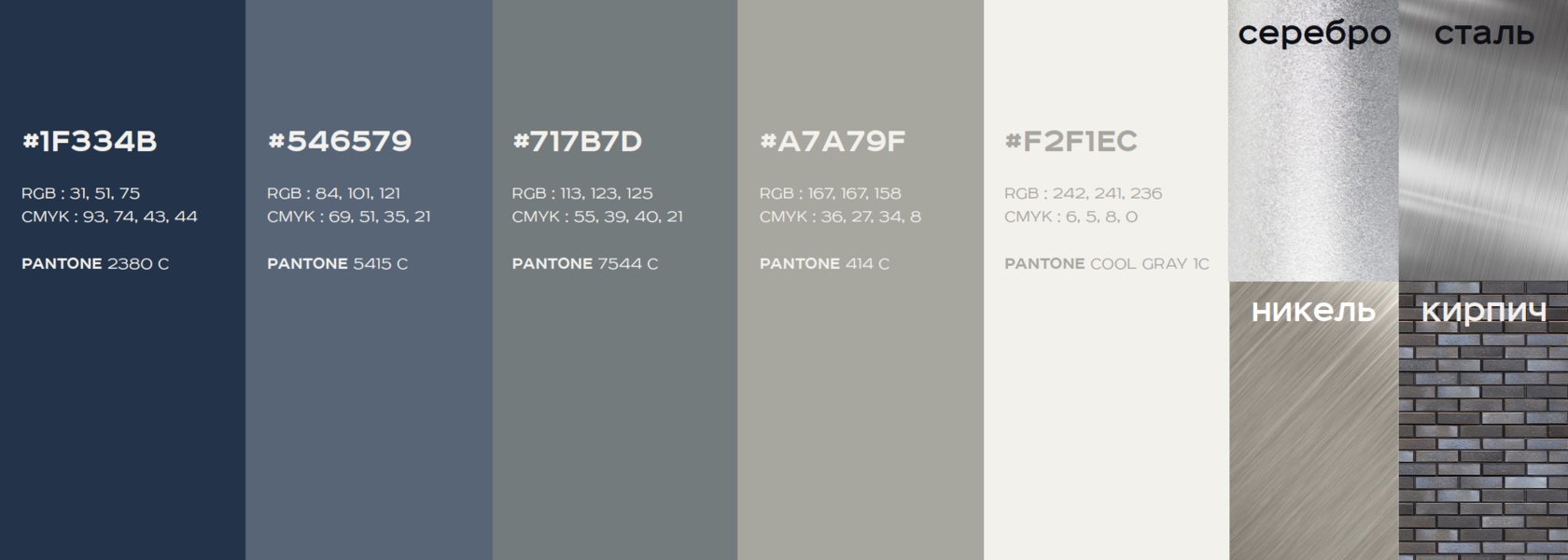 Фирменная палитра состоит из пяти основных цветов, дополнительного черного цвета (используется для текстового набора)